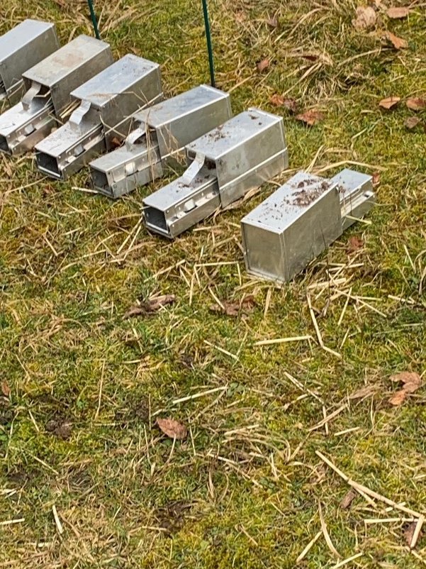 Traps from the previous day were collected, those that had the door triggered were carefully picked up, carried from the top as to avoid any urine or anything from getting on your hands if it seeps out. The triggered traps were placed in a line in the order of which they were placed, this meant we would have a clear idea of where to release the animals so to not place them in the wrong territory. Traps were placed slightly downhill again. When emptying the traps we would place them facing downward door first, release mechanism can be seen in the picture, the tunnel part of the trap would drop and the hope was the bedding the main part of the trap would follow with a possible animal if they did not come out straight away the base would be carefully shaken or tapped.